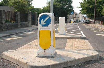 The Islands normally have yellow and white plastic bollards with a blue arrow to remind motorists to keep left. Kerbs are dropped at both sides of the road, usually with tactile paving where the pavement slopes towards the road.